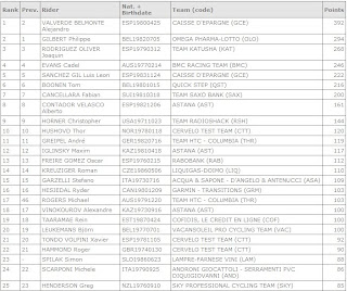 First, the Court or Arbitration is expected to send Valverde into sporting exile so this should be the last time his name appears. Philippe Gilbert, an outspoken supporter of anti-doping measures will then be the number one rider in the world. Obvious symbolism there.