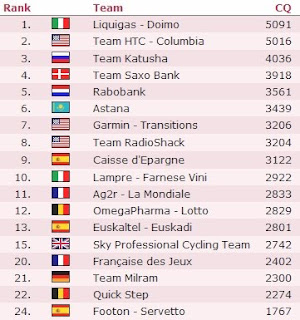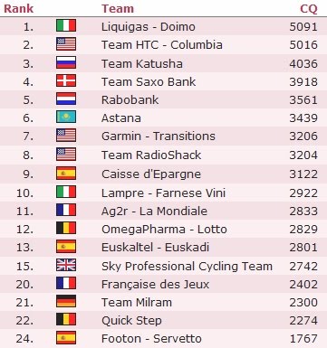 These are the ProTour teams which explains why the “ranking” column has gaps. Liquigas-Doimo are at the top of the table for now, not surprising given their excellent Giro but they have been taking wins everywhere this season.
