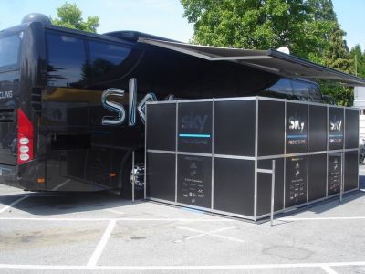 That’s the Team Sky bus, but notice the wall. It’s put up so riders can warm-up on their turbo trainers before a race without the pesky public being able to watch.