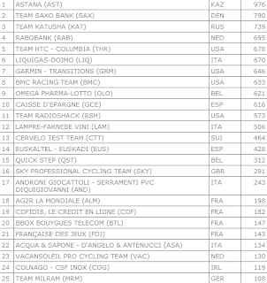 As you can see the likes of Quick Step and Team Sky are hovering in a lowly position. The creation of the new Luxembourg team is likely to bump them down a notch, meaning they make the Vuelta a priority in order to ensure Ag2R-La Mondiale doesn’t use Arrieta and Nocentini to bag points, and that Cofidis too doesn’t see Moncoutié and Dumoulin as points grabbers. Sky should be able to pick up some points in the Vuelta but you have to wonder about Quick Step, given Tom Boonen’s still absent from the bunch.