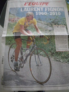 Laurent Fignon is on the front page of all the French newspapers I saw in my local tabac today. L’Equipe calls him “Un Mec à Part“, or a “different kind of guy”.