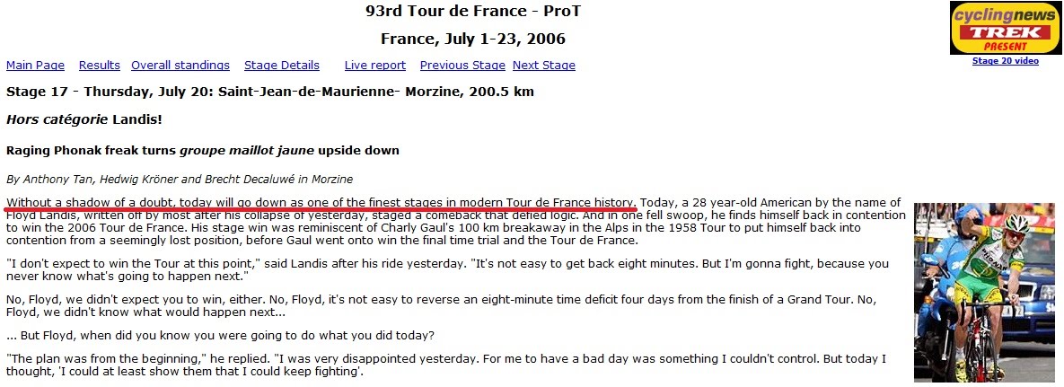 Sadly today we know that was more than a shadow of doubt, Landis was caught doping. Stripped of the stage win and indeed his Tour de France win, today Landis has effectively lost everything.
