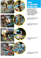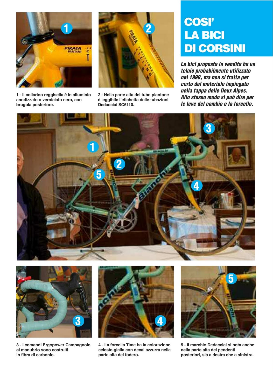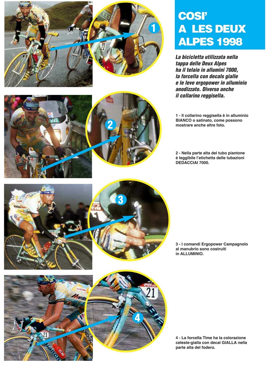 Only the Pantani family have come forward to point out discrepancies. They show for example that Corsini’s bike has carbon fibre Ergopower levers, but Pantani rode the 1998 Tour with alloy levers, and there are other differences, click on the images above to compare.