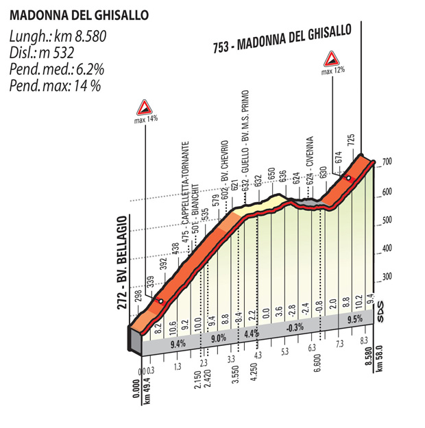 Strictly this is the Colle del Ghisallo, the mountain pass. The Via Valassina climbs out of the swanky town of Bellagio, with its luxury lakeside villas. The climb is 10km long and averages 5.2% but beware as the climb is broken in two parts as the profile below shows.