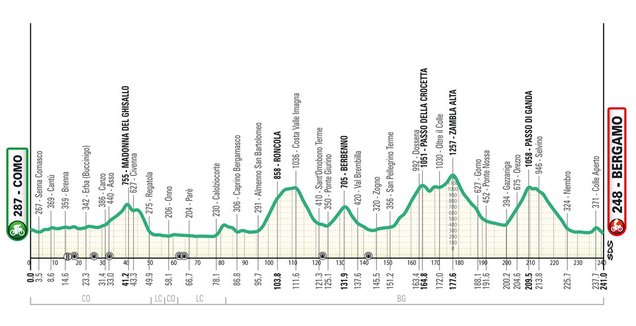 The Course: Como to Bergamo, 241km with almost 4,500m of vertical gain. It’s the same as 2021 and 2023. This is a quasi-Alpine course characterised by long climbs rather than sharp walls. The first climb is to the Madonna del Ghisallo chapel, with the sacrilege of climbing up from Asso rather than from Bellagio.