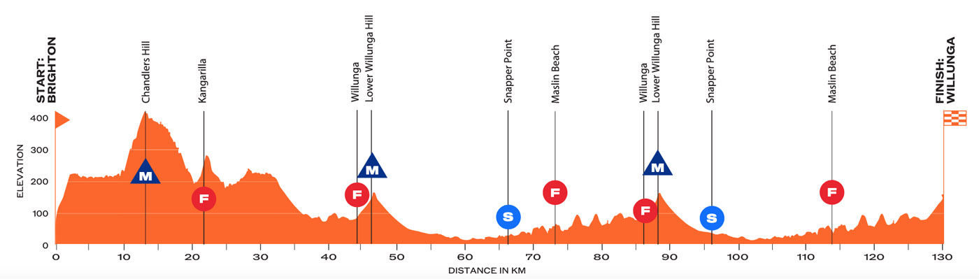 I expect the only necessary modifications to be extending the time for refreshments from the team vehicles. This stage already has more feed zones than the mandatory amount under the updated UCI guidelines introduced last year, but adding an extra optional feed zone halfway around each of the Willunga-Aldinga-Tatachilla loops might also be possible.