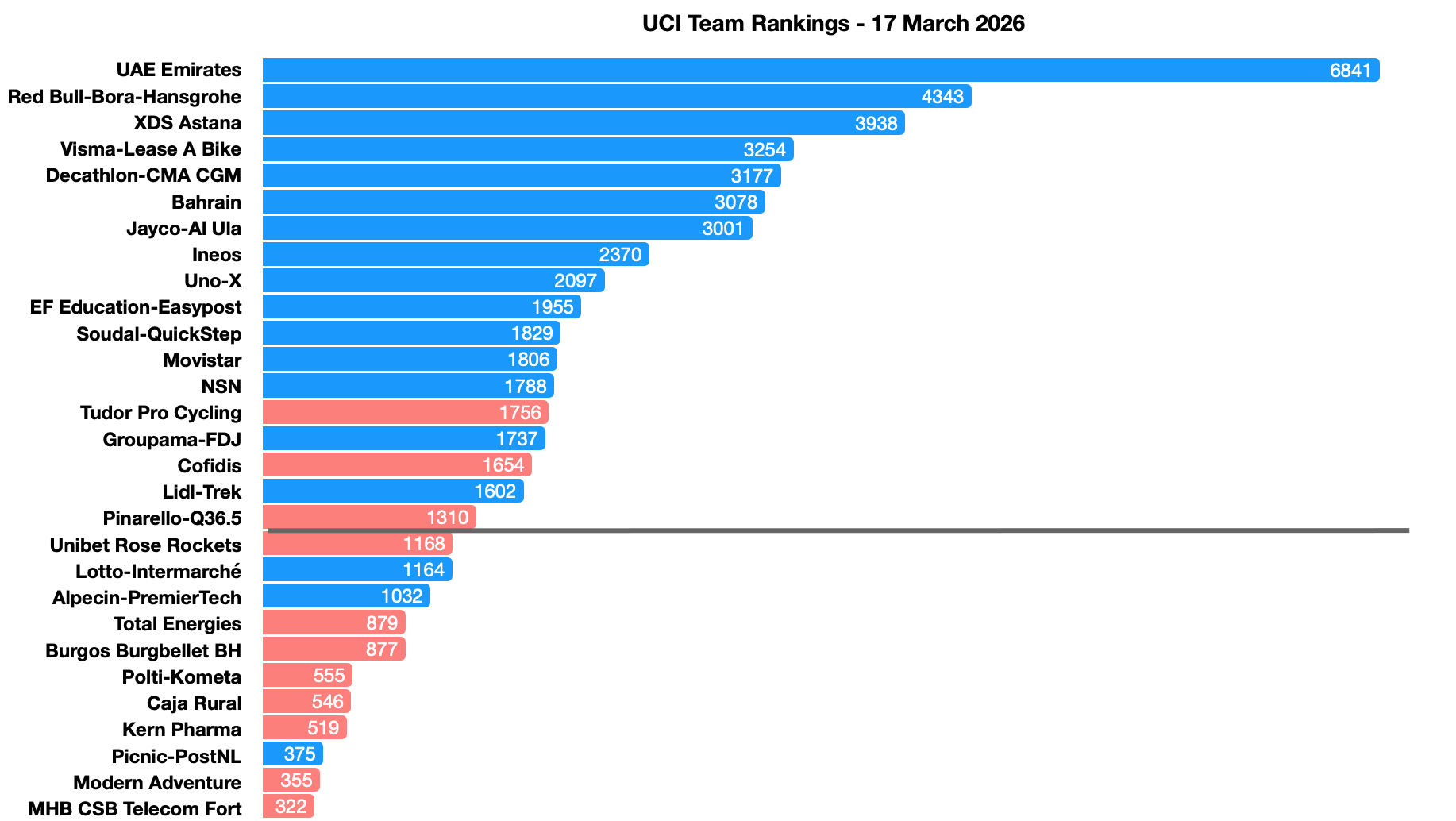 The red bars in the chart mark ProTeams, the second tier. Here Tudor, Cofidis, Pinarello-Q36.5 all sit above the line to mark 18th place and so are virtual promotion candidates. Yes there’s a long way to go but they’re doing what they need to so far.