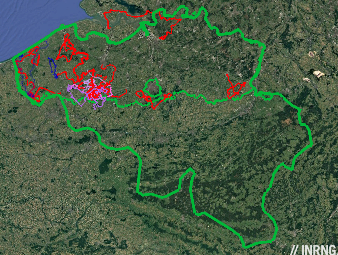 The map above shows Belgium within the thick green national border and the Flanders-Wallonia border running east-west, as well as the circle of Brussels.